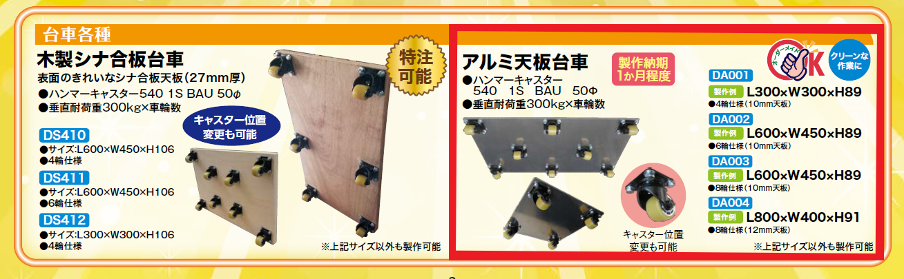 アルミ台車・アルミ資材(青色背景)・テムローラー・門型ランサーに関しては、お見積並び、供給ができなくなりました。